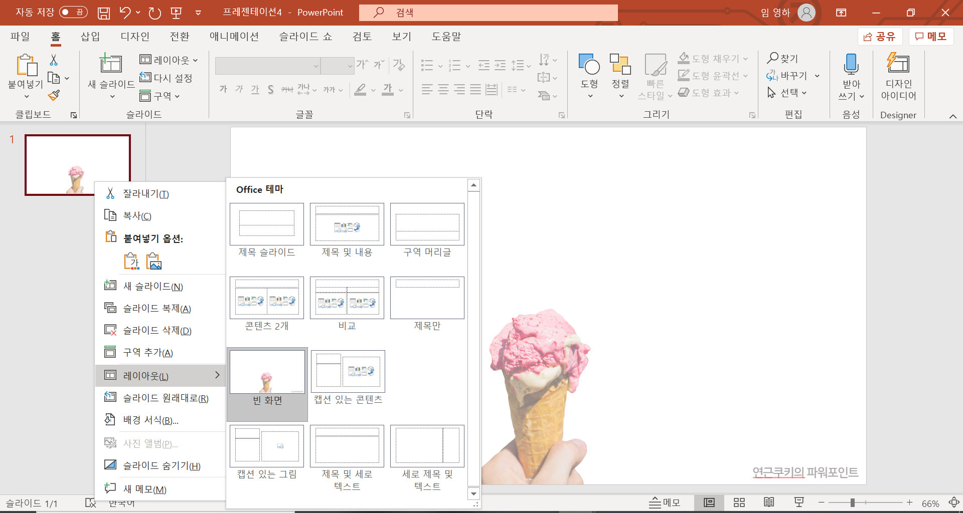 빼고 싶은 슬라이드의 레이아웃만 다른 레이아웃으로